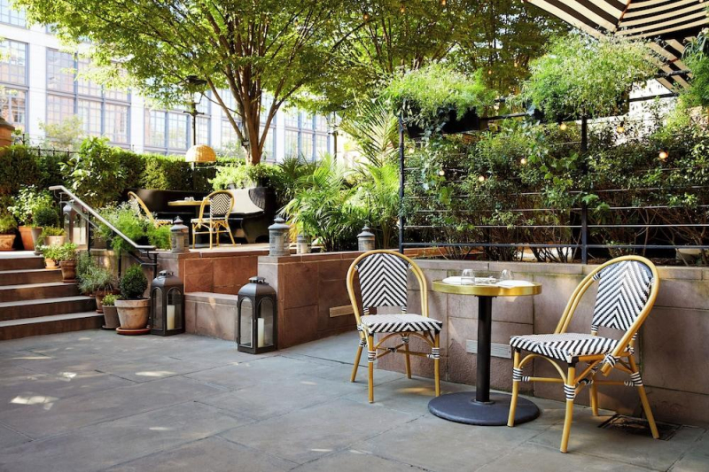 Nestled in the heart of Chelsea?s buzzing gallery district, The High Line Hotel is a completely unique and inspiring respite from the harried pace of downtown Manhattan. Just off 10th Avenue, the gated Parisian style courtyard complete with lush gardens demarcated by gas lamps, beckons passers-by to step into a different era. The centuries-old collegiate gothic-style brick buildings lend an air of gravitas without overwhelming the property.Light pastries are available in the café located in the lobby.This is a traditional building.The lobby is medium in size.The High Line Hotel Guestroom interiors evoke a romantic and eclectic 19th century guest house. Guests enjoy a spacious room with luxurious bedding and down pillows. Each room is outfitted with unique, vintage, one-of-a-kind furniture sourced from around the United States. Rooms feature large windows that open with natural light spilling into each room and a blackout shade option, vast well-lit bathrooms, and spacious closets. Guestroom amenities include plush 400 thread-count bedding, lush bathrobes and slippers, turndown service, overstocked mini bar (coming soon), C.O. Bigelow bath amenities, complimentary Wireless Int