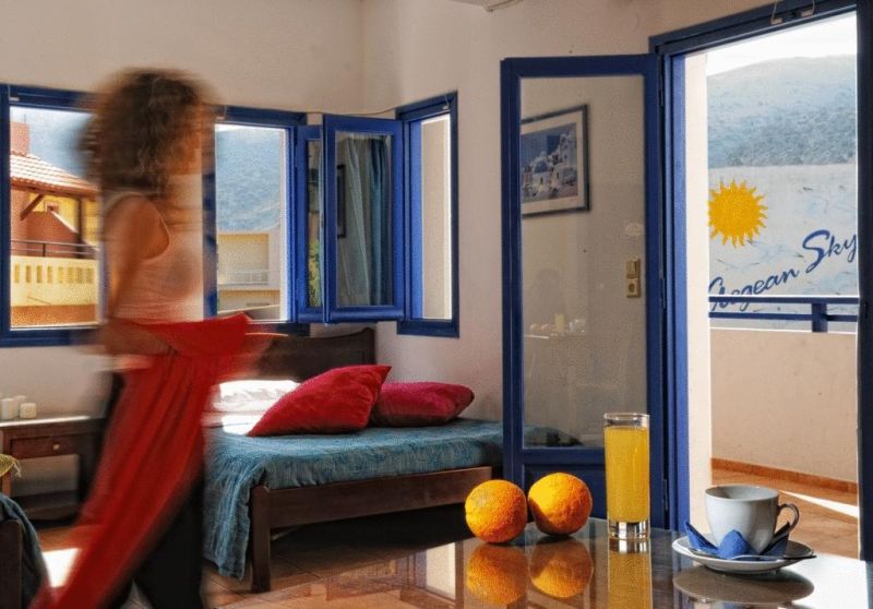 Las habitaciones con vistas al jardín están equipadas de forma cómoda, con vistas agradables a los jardines y cuentan con todas las comodidades, tales como aire acondicionado, televisión por satélite y una práctica kitchenette. Algunas se encuentran en el edificio principal Aegean Sky 1 y otras están cerca del anexo Aegean Sky 2 situado a pocos pasos