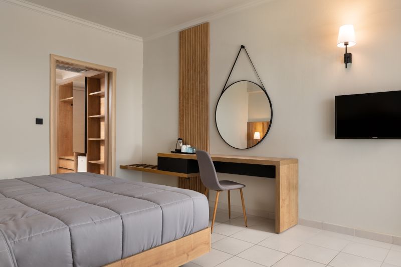 Las habitaciones enmoquetadas son de tamaño medio, tiene balcón privado, frigorífico y televisión. Todos los cuartos de baño de mármol tienen bañera.