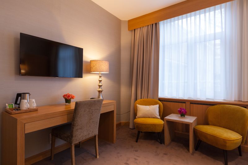 Las habitaciones están dotadas de cuarto de baño privado con ducha o bañera y secador de pelo, ventilador, radio, teléfono, televisor, calefacción regulable, escritorio, cama doble, caja fuerte y servicio de despertador/reloj despertador.