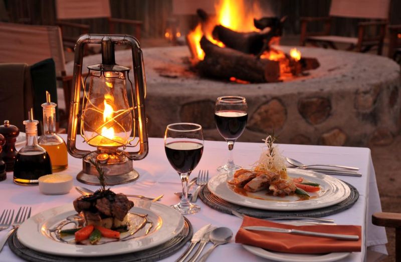 Los huéspedes ofrecen una deliciosa cocina panafricana en el comedor al aire libre tradicional Boma iluminado por el fuego o en la espaciosa zona de comedor.