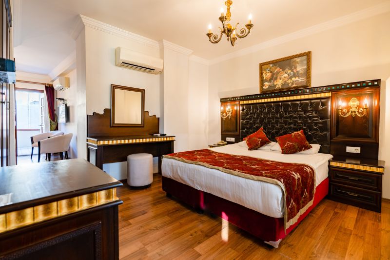 Las habitaciones se encuentran entre los tres edificios que rodean el patio. Las habitaciones han sido decoradas con arquitectura otomana y con altos estándares en mente. Todas las habitaciones tienen televisión LCD, aire acondicionado, minibar, teléfono directo, acceso a internet, cuarto de baño con secador de pelo. Algunas de las habitaciones varían de tamaño debido a la disposición de cada edificio.